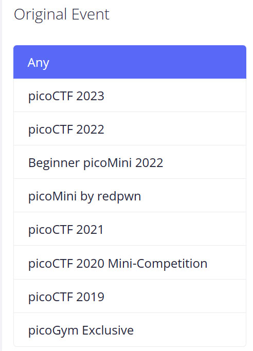 PicoCTF练习界面的左下方按照赛事对题目进行了分类,如果答题者希望能够像参加真实比赛一样答完一整套题目,可以直接选择对应的年份。目前PicoCTF提供的赛事历年题目如图1-6所示。
