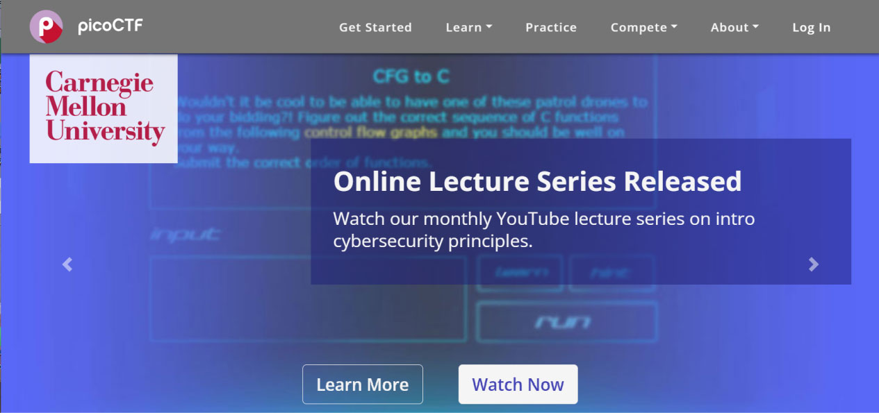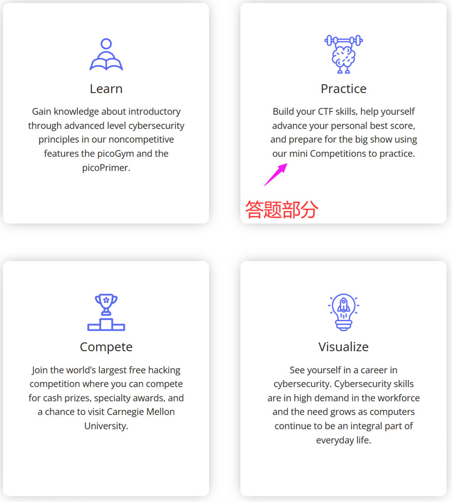 PicoCTF除了每年举办比赛,还提供了一个提供其历年比赛真题的在线平台。通过这个平台,学习者可以在熟悉CTF比赛题目的同时,了解各种信息安全的知识点。图1-1所示为PicoCTF网站首页。
