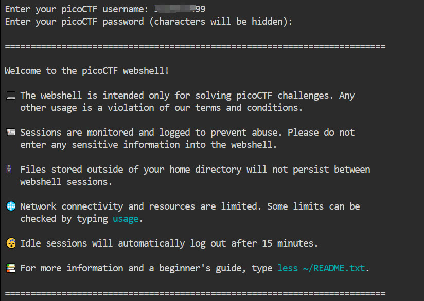 使用网页版Linux答题环境前,需要先输入答题者在PicoCTF的用户名和密码。输入正确的用户名和密码后的Linux答题环境,如图1-10所示。