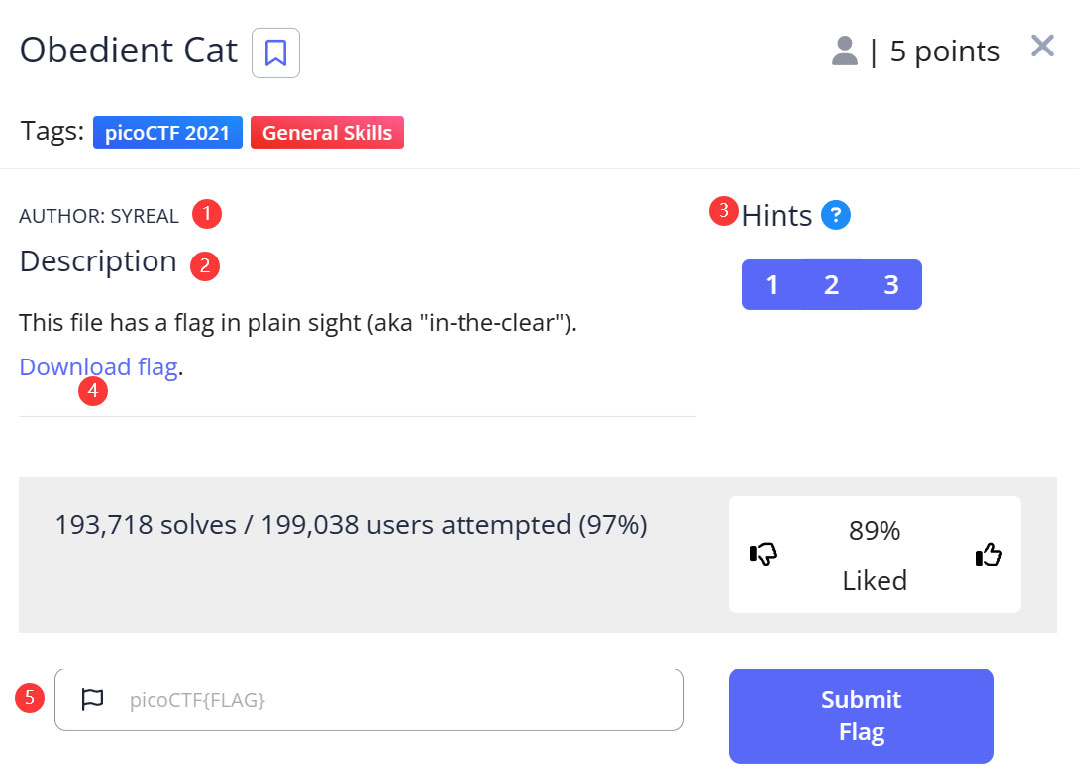 以“Obedient Cat”为例,这道题目提供了3条线索,这些线索其实也是PicoCTF的魅力所在。它们一方面给出了题目的提示,另一方面也帮助答题者更好地掌握网络安全的知识点。