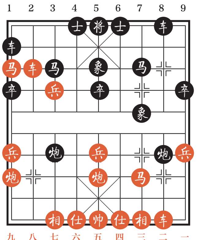 如下图所示,双方棋子数量和配置相近,红方棋子占位更有优势。