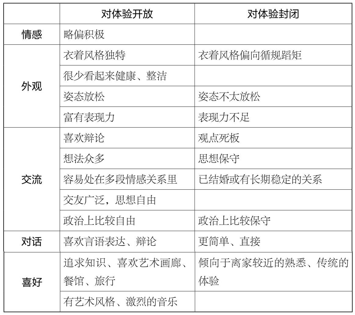 表2.10对人们开放/封闭特质的主要区分点进行了归纳总结,如下所示。