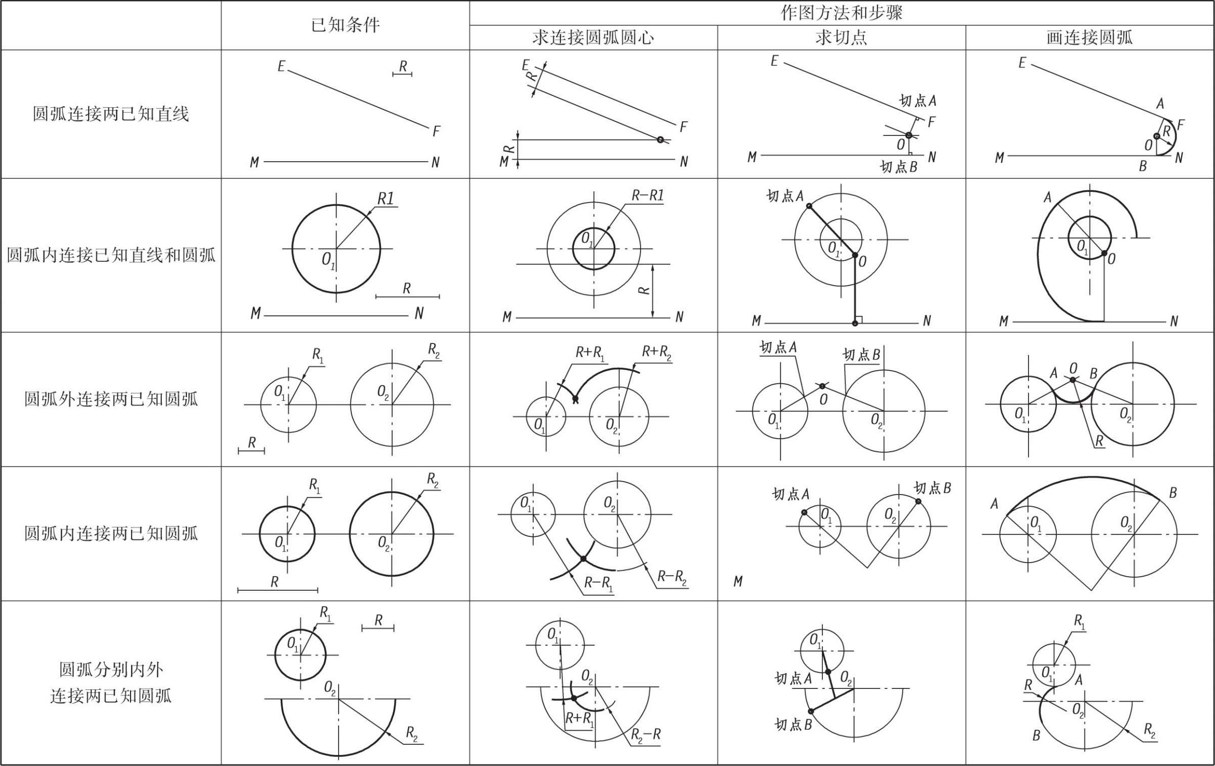 (2) 与已知圆弧相切的圆弧 , 其圆心轨迹为已知圆弧的同心圆 , 其半径为 R : 外切时 , 连 接圆弧与已知圆弧的半径之和 ; 内切时 , 连接圆弧与已知圆弧的半径之差 。 连接点为 : 外切 时 , 连心线与已知圆弧的交点 ; 内切时 , 连心线的延长线与已知圆弧的交点 。