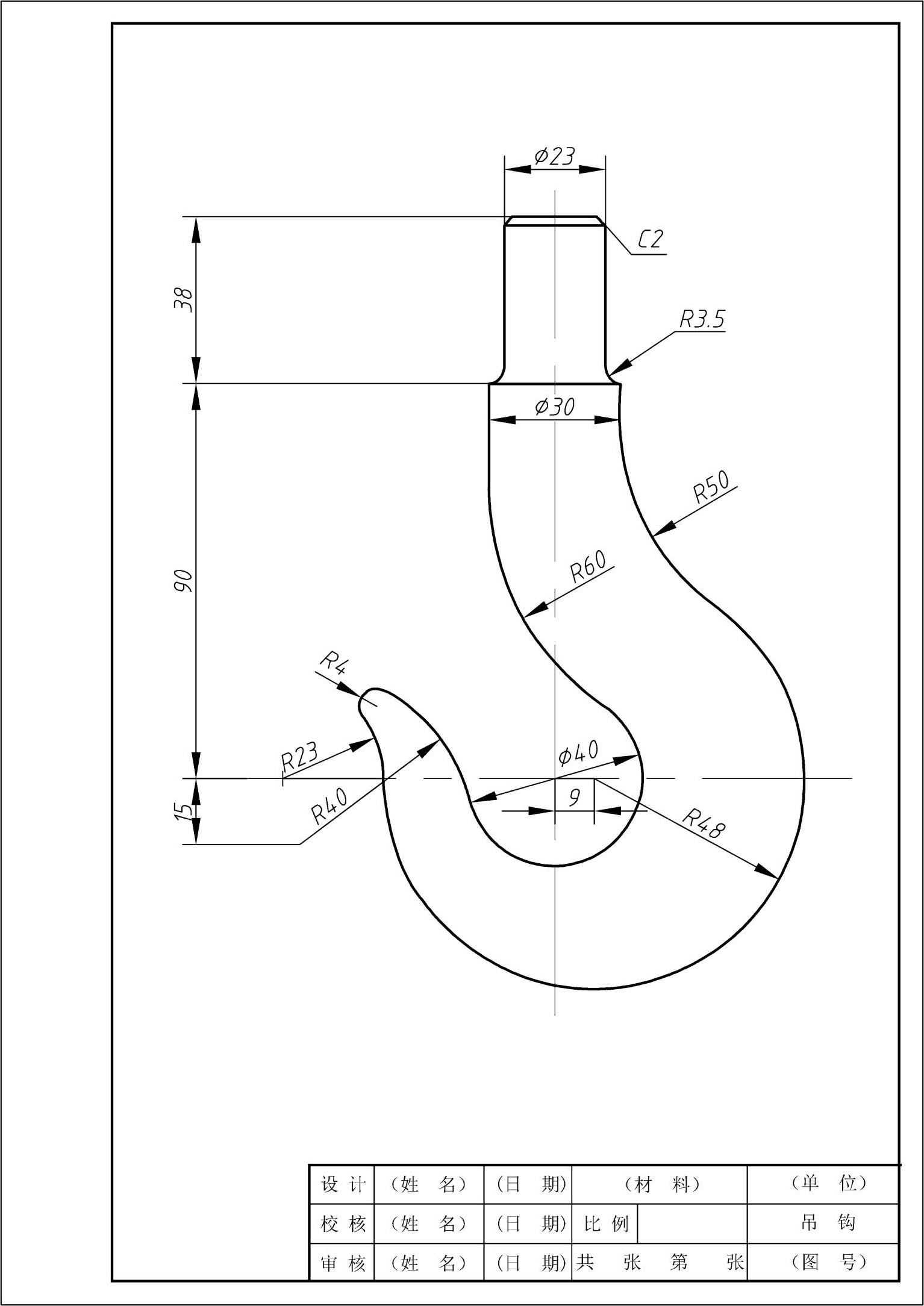友情提示 : 分析图形 , 先绘制已知线段 , 再绘制中间线段 , 最后连接线段 。 吊钩下方主要 部分尺寸 ϕ 30、 R 60、 R 50、 ϕ 40、 R 48、 R 40、 R 23、 R 4 中 , 已知线段有 ϕ 40, R 48, ϕ 30( 直线段 ), 中 间线段有 R 40、 R 23, 连接线段有 R 50、 R 60、 R 4。