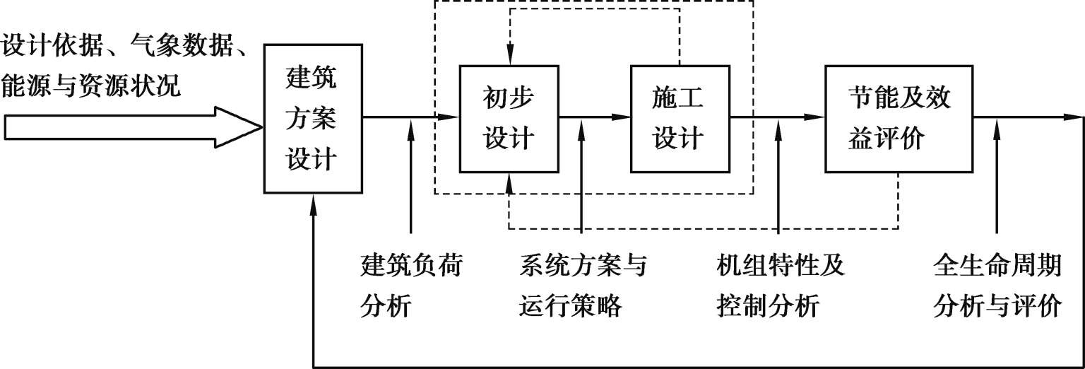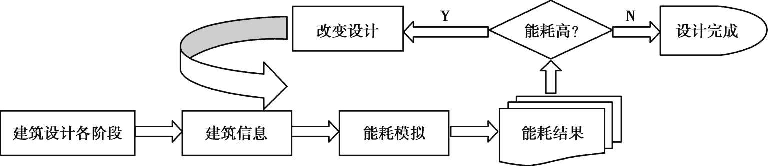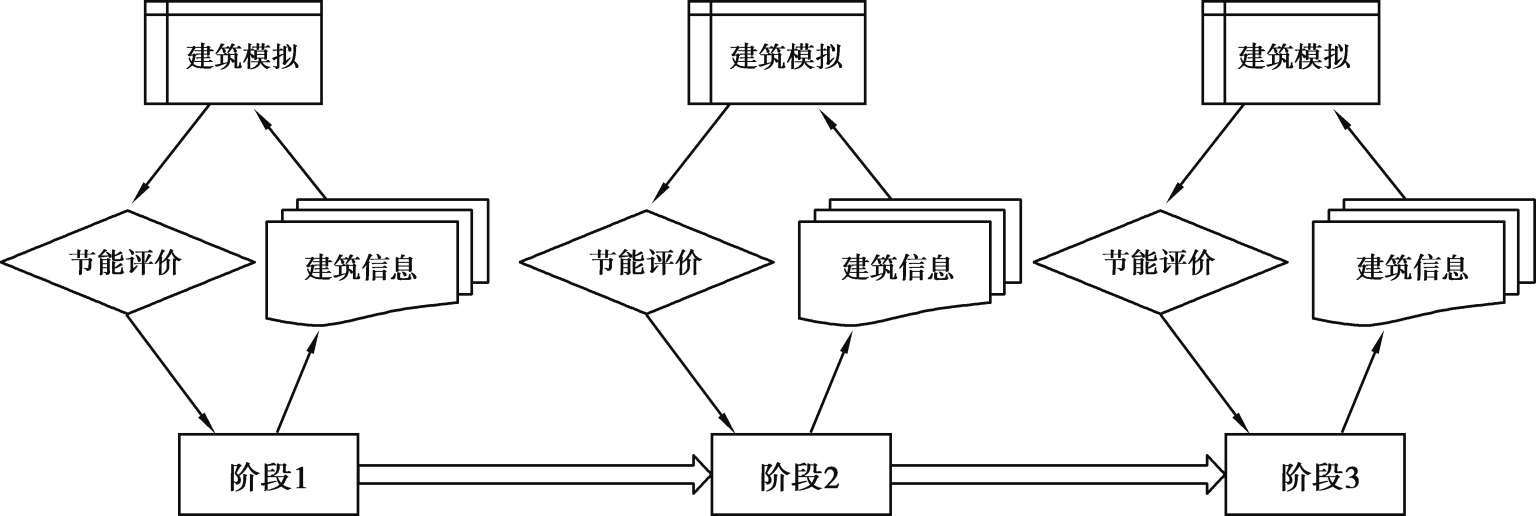 徐峰等人建立了“以建筑节能为目标的集成化设计方法与流程”,将建筑模拟计算与建筑设计过程结合起来,实现建筑节能设计。根据不同的设计阶段有不同的设计任务、不同的已知和未知条件,不同阶段的设计应有各自的循环设计、评价与反馈过程。这种设计方法和流程体现了设计的综合性和闭合性,每一个设计阶段的设计都是在前阶段设计工作的基础上的进一步创作与细化,每个阶段建筑师、结构师、暖通空调工程师和能源师进行专业配合;同时每个阶段又都有其相对的独立性,其主要的任务不同,面临的问题也不同。
