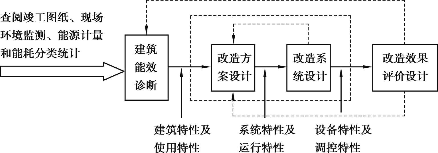 由于既有建筑本身的特性,在节能改造设计中其设计方法和流程与新建建筑存在一定区别。既有建筑节能改造是在确保建筑物结构安全、满足使用功能和抗震与防火的前提下,既要提升建筑环境品质,又要提高建筑能源效率。既有建筑节能改造设计的一般程序如图 2.3 所示。