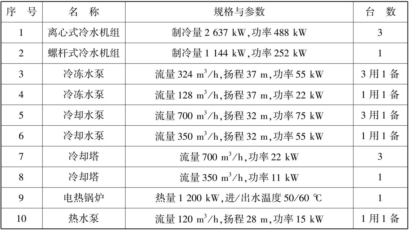 主教学楼总空调面积为37 042 m 2 ,设计冷负荷8 900kW,热负荷1 100kW。本书选择了3台离心式机组(型号19XR6565467DH552,制冷量2 637kW,功率488kW)和1台螺杆式机组(型号30HXC350A,制冷量1 144kW,功率252kW)作为主教学楼的冷源。主教学楼空调系统设备如表2.2所示。暑假期间基本开启一台离心机组即可满足空调负荷要求,主教学楼空调系统设备选型存在较大的余量。