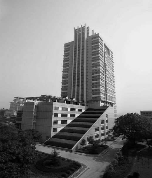 为了研究高校主楼的能耗特征,下面将以重庆大学主教学楼(后文简称“主教学楼”)为研究对象。主教学楼位于重庆大学A区,北临嘉陵江,南临民主湖,是一座集办公、教学、科研、会议于一体的综合性大楼。总建筑面积为70 032 2 m,除地下机房、车库等外实际使用面积为55 155 m 2 ,建筑高度为99.1 m,地下3层,地上26层。负三层为设备用房,负二层为地下车库,负一层至地上五层为教室、会议厅、展厅等,六至二十六层为塔楼部分,主要用途为办公室、实验室。主教学楼的外观如图2.3所示。