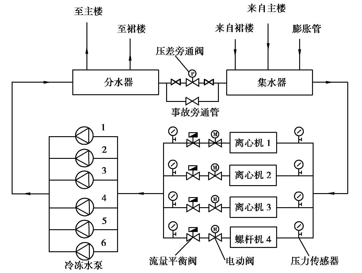 主教学楼空调水系统如图2.4所示。水系统采用两管制,分两路分别接至主楼和裙房空调区域,每路设置水力平衡阀。主楼竖向及各层水平方向均为同程式设计,裙楼水系统采用异程式设计。