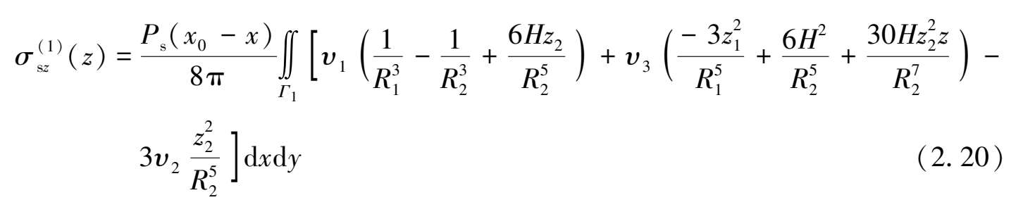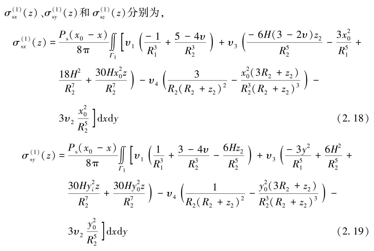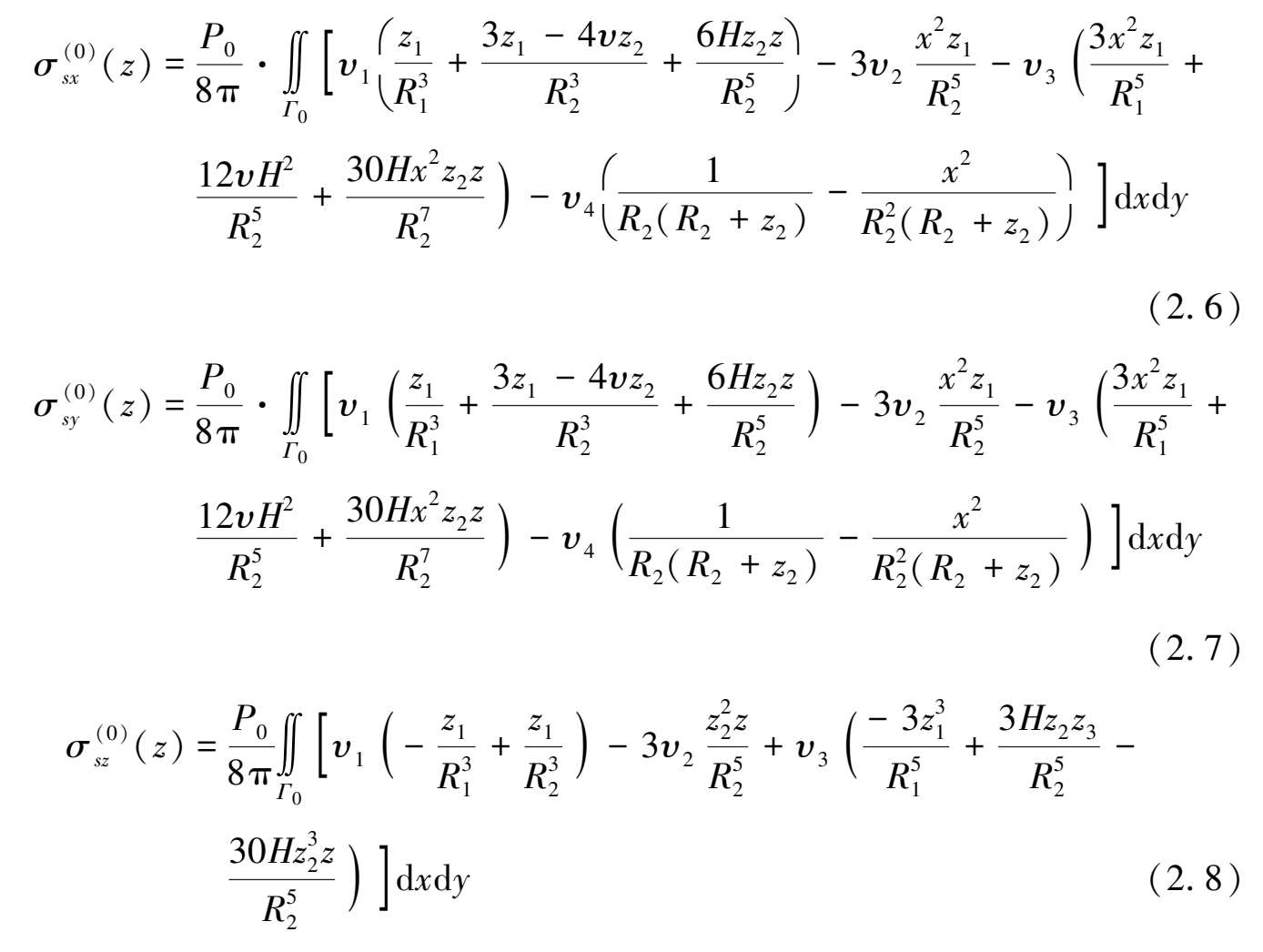 求出编号为①的基坑侧壁面上的土体总水平卸荷向量{P s }后,采用插值法拟合出其对应的连续函数P s 。整个侧壁面卸载的影响相当于无数个单位面积上卸载影响的叠加之和,根据Mindlin应力解,采用积分的方法可得到编号为①的基坑侧壁面上土体水平卸载在下方地层j中任一点处引起的附加应力分量