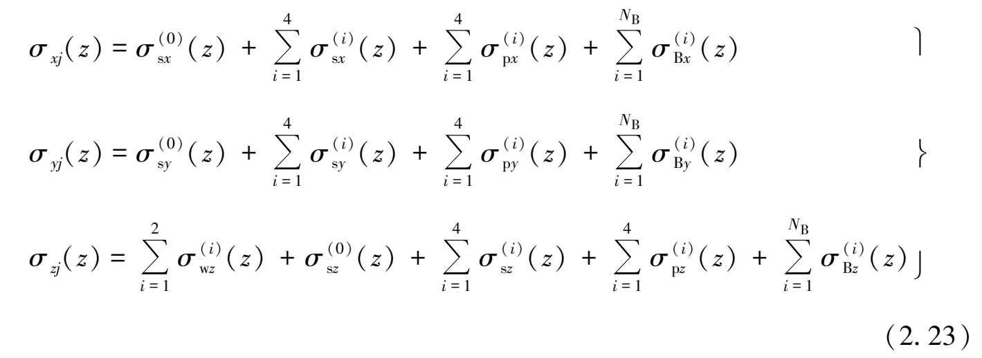 的推导,可以分别求解出 4 个侧壁面上围护墙的水平作用在下方地层j中任一点处引起的三向附加应力,分别为编号为①的侧壁面围护墙产生的