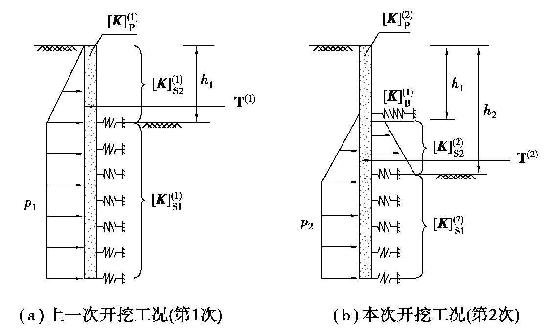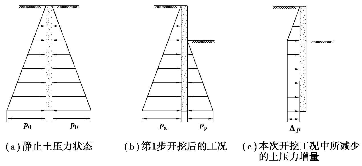 ——本次工况的开挖深度;采用杆系有限单元法可以将初始土压力增量荷载