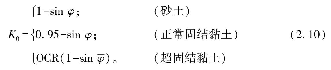 K 0 ——静止土压力系数,取值可通过原位静止侧压力试验确定,在缺乏试验资料时也可通过以下经验公式估算: