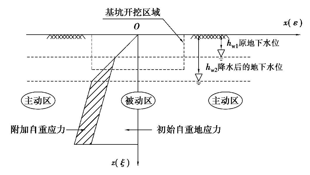 在地下水丰富的城市,基坑施工容易受到地下水的影响,为防止发生渗透破坏,开挖前通常会采取一定的降水措施,将地下水位降低到坑底面以下一定位置。一方面,工程降水会使土骨架有效应力增大;另一方面,由于基坑内外存在的水头差会使土体产生渗流动水压力。这两种应力的作用都会使土体固结压密,并产生附加应力 [101] 。如果把土体开挖对邻近隧道的影响视为卸载行为,那么工程降水则相当于是一种加载行为。