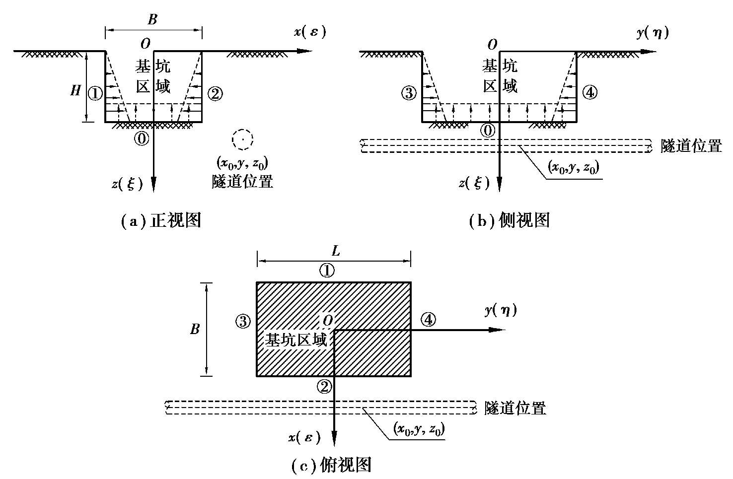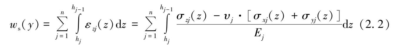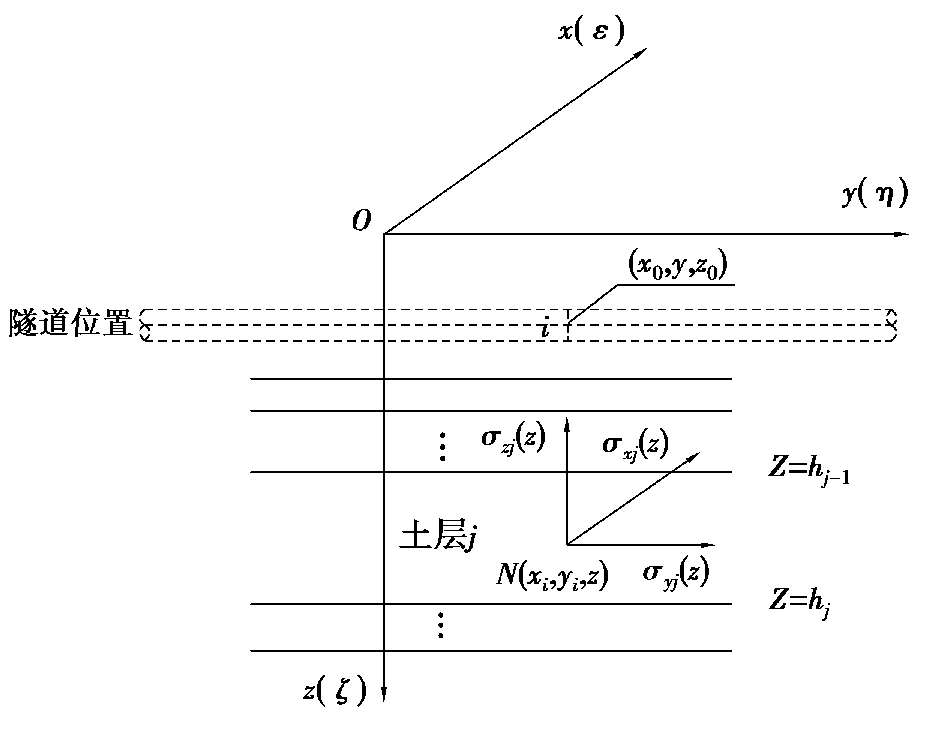 可见,只需要求解出基坑施工在下方地层j中任一点处引起的土体三向附加应力σ xj (z)、σ yj (z)和σ zj (z)之后,然后再代入式(2.2)中即可求解出基坑开挖在下卧隧道轴线位置上引起的土体自由场位移解w 1 (y)。