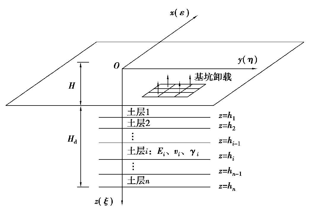 为了简化计算,同时又能体现地基分层特性给土体变形性能带来的影响,本研究采用一种近似的简化弹性理论分析方法,其采用的弹性半空间层状地层分析模型如图 2.2 所示:假定基坑地基变形影响深度(H d )范围之内的土体是由n层有限厚度的弹性水平层构成,第i层土体底面的深度为h i ,并具有基本参数E i 、υ i 和γ i 。这里的地基变形影响深度H d ,是指该深度以下土层因开挖引起的附加变形可以忽略不计。关于H d 的下限值,本研究参照国家《建筑地基基础设计规范》(GB 50007—2011) [9] ,取开挖引起的地基竖向附加应力σ z ( y)不大于土体有效自重应力的 10%。