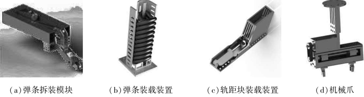 关键功能模块设计图如图 1 所示,Ⅲ型扣件快速拆装系统装配设计图如图 2 所示,Ⅲ型扣件快速拆装系统产品设计图如图 3 所示,Ⅲ型扣件快速拆装系统样机初步装配图如图 4 所示。
