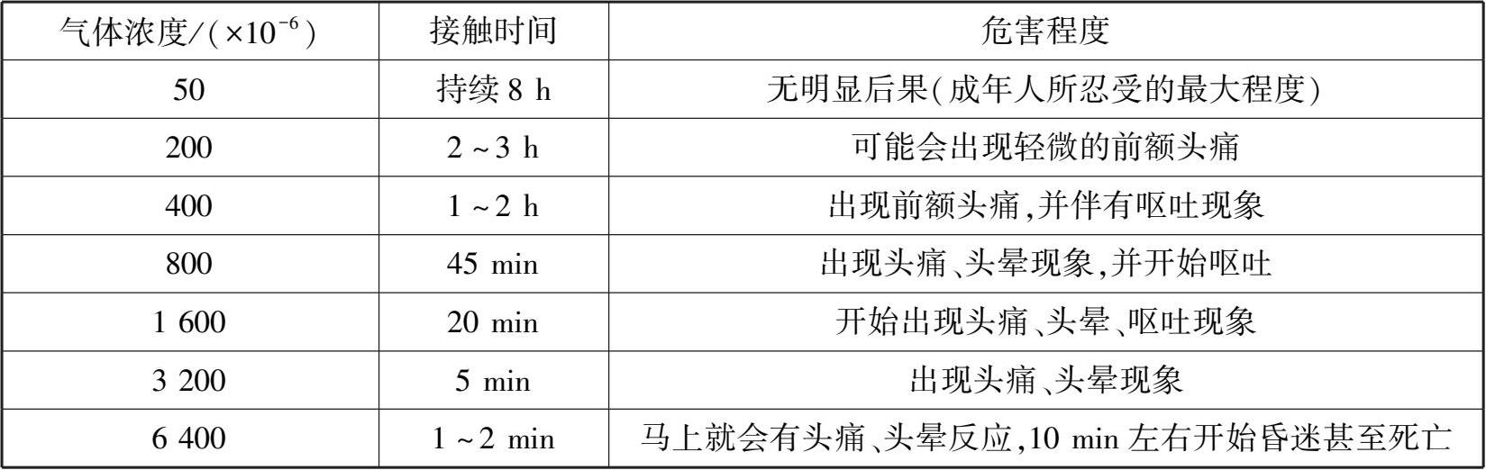 表 2-5 不同浓度的CO对人体的影响