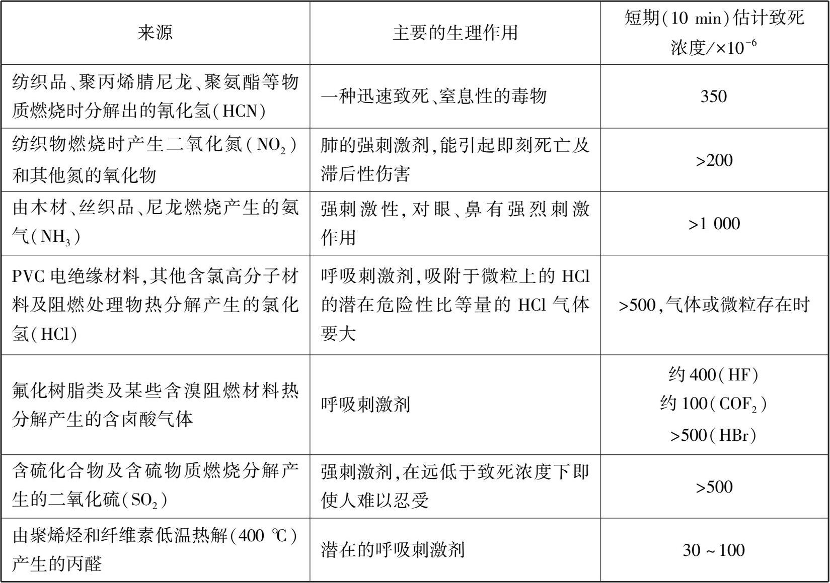 燃烧产物有不少是毒害气体,往往会通过呼吸道侵入或刺激眼结膜、皮肤黏膜使人中毒甚至死亡。据统计,在火灾中死亡的人约 75%是由于吸入毒性气体而中毒致死的。燃烧产物中含有的这些有毒成分均对人体有不同程度的危害。常见有害气体的来源、生理作用及致死浓度见表 2-4。