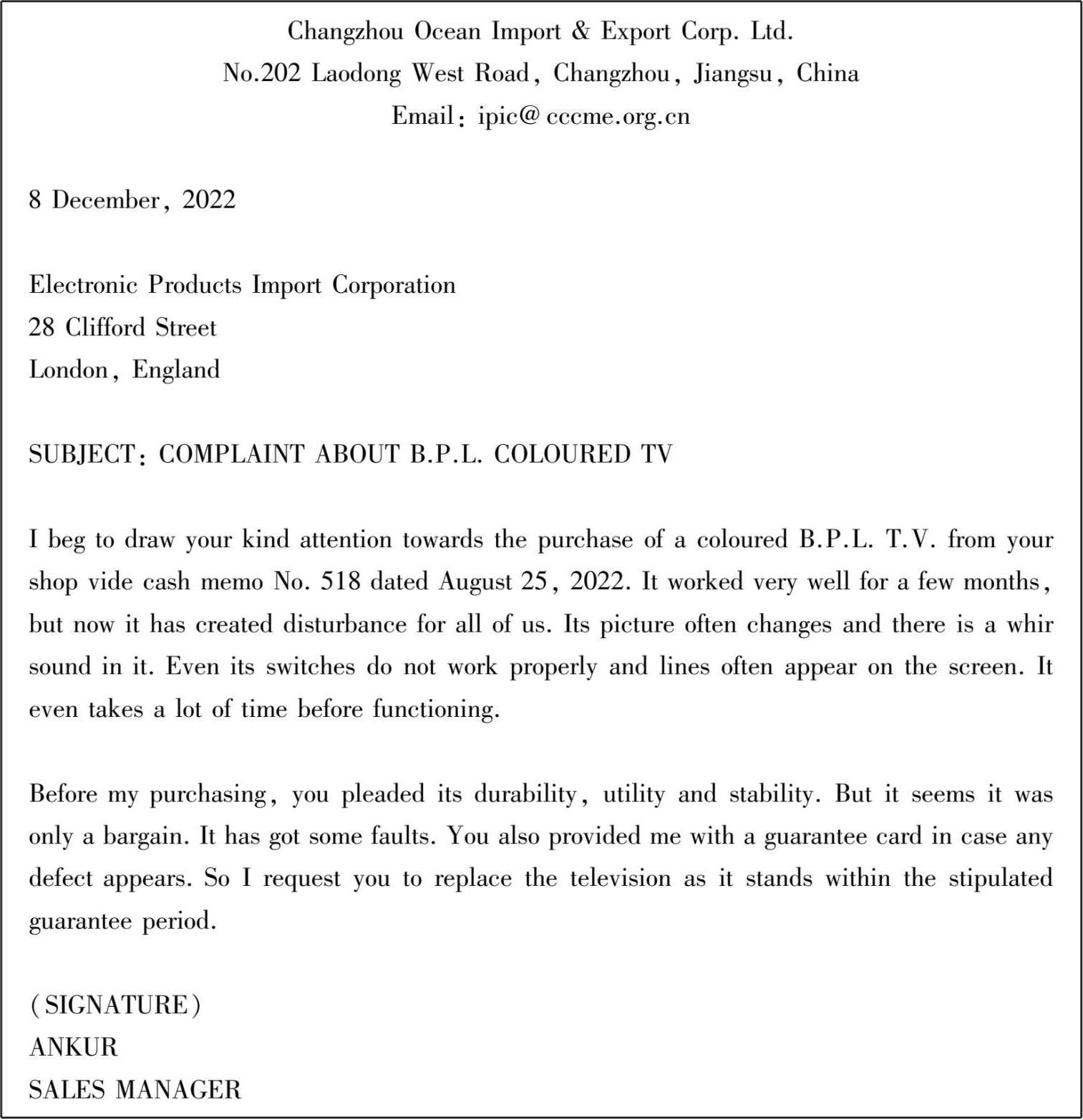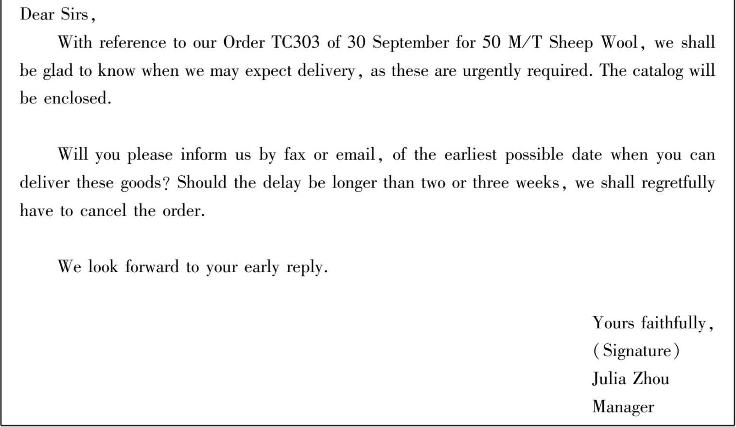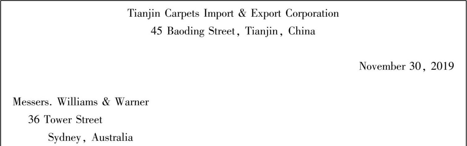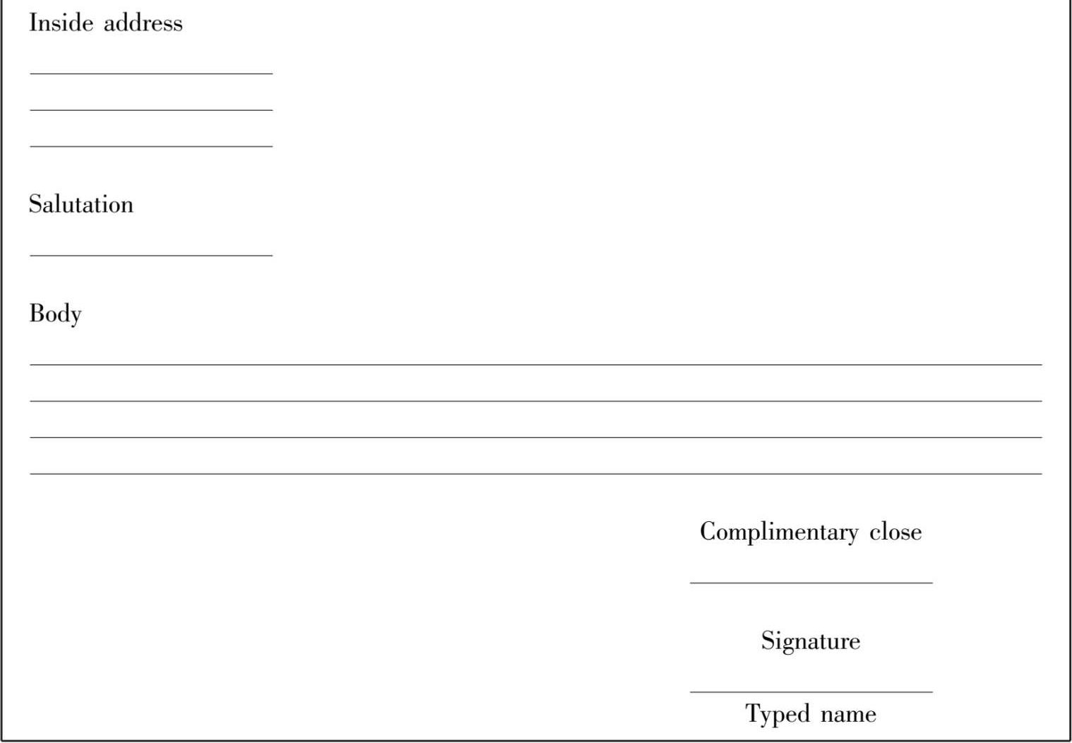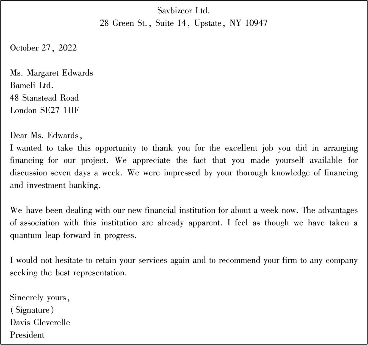 The most common layout of a business letter is known as the full block format.Using this format,all the body parts(from the date line)start from the left margin.Paragraphs are singlespaced,not indented,with a double space between paragraphs.