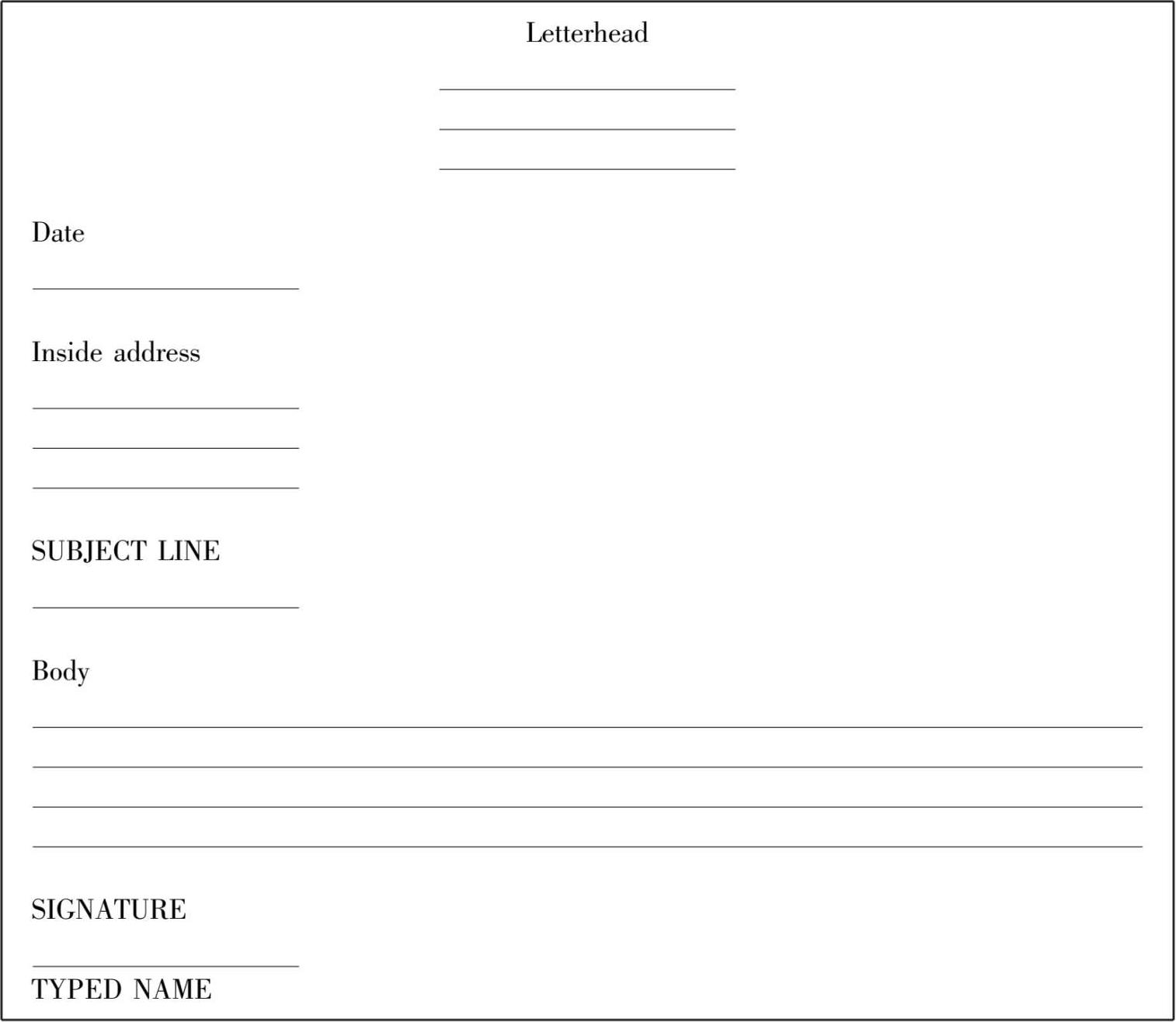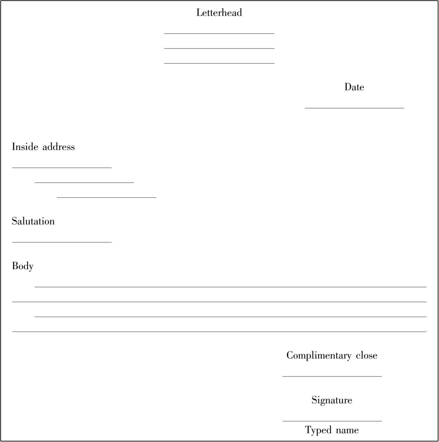 With this format,all lines from the date line begin at the left margin.A subject line typed in all capitals replaces the salutation.Instead of a complimentary close,the sender’s name and title are typed in all capitals below the last line of the body part.