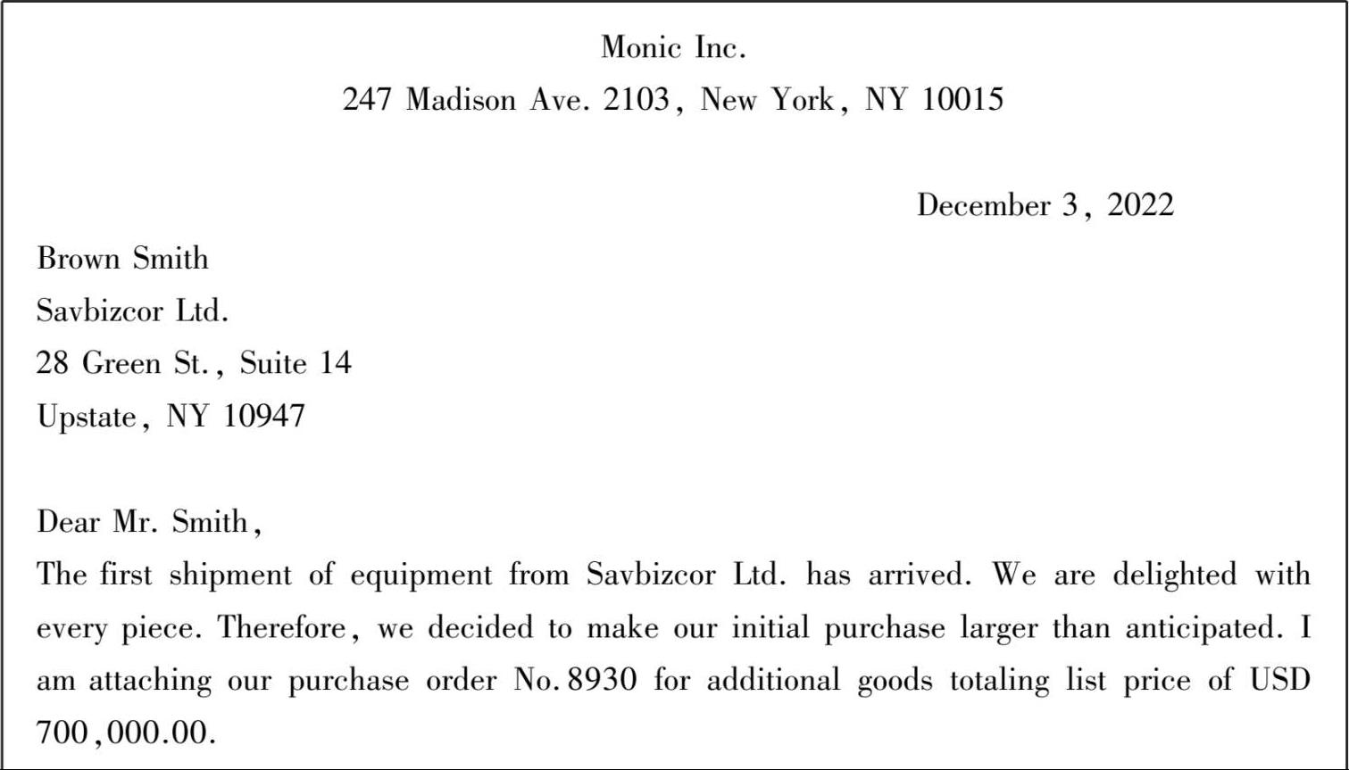 The physical appearance of a letter is very important to grasp the receiver’s attention.A letter’s appearance often reveals the writer’s character and the organization he belongs to.There are various ways in which the parts of a business letter can be laid out on the page.Choice of letter format is a matter of individual taste,but it is better to follow established practice,to which the business world has become accustomed.A good plan to make correct practice habits is to adopt one form of letter format and stick to it.You should be familiar with at least four business formats:full block,modified block,simplified and intended.