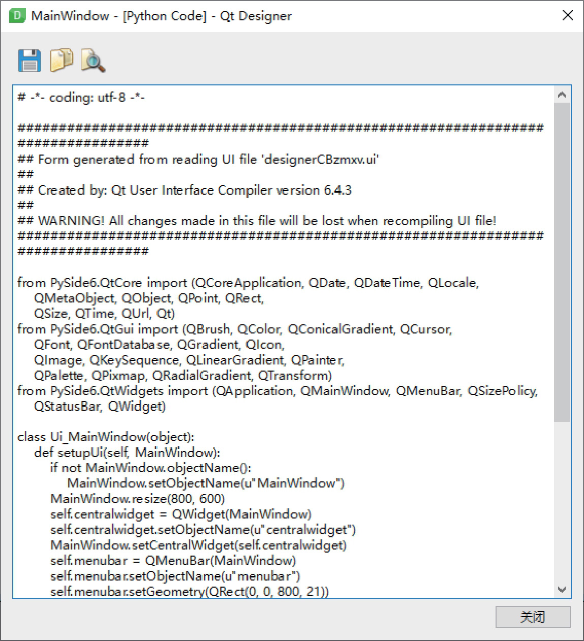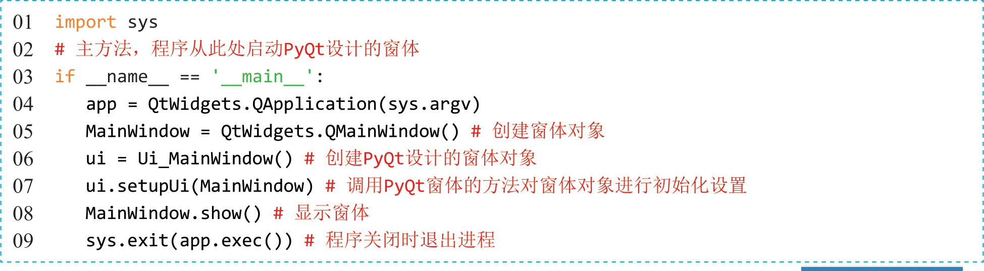 通过上面的步骤已经将在Qt Designer中设计的窗体转换为了.py文件,但是还不能运行,因为转换后的文件代码中没有__main__主方法,因此需要添加主方法,并在其中通过MainWindow对象的show()函数来实现,代码如下: