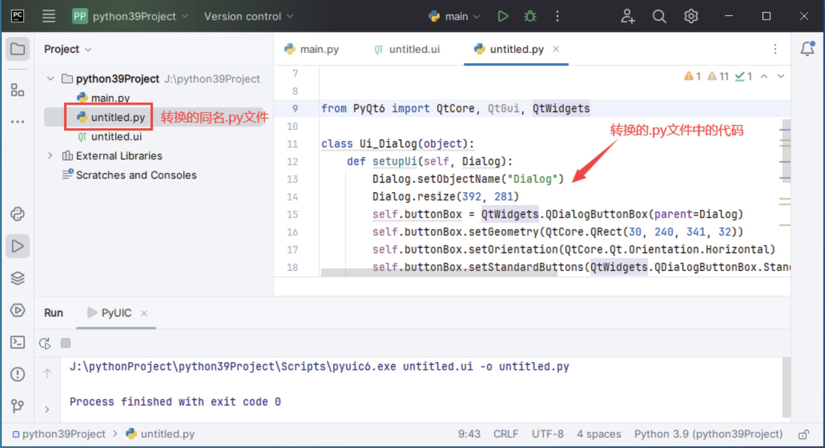 在2.3.2节中,我们配置了将.ui文件转换为.py文件的扩展工具PyUIC,在Qt Designer窗口中可直接使用该工具将.ui文件转换为对应的.py文件,步骤如下。