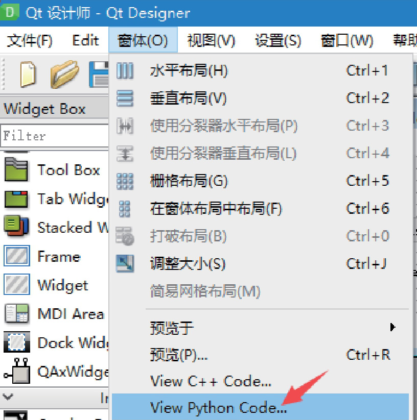 设计完窗口后可直接在Qt Designer设计器中查看其对应的Python代码,方法是选择菜单栏中的“窗体”→“View Python Code”,如图3.29所示。