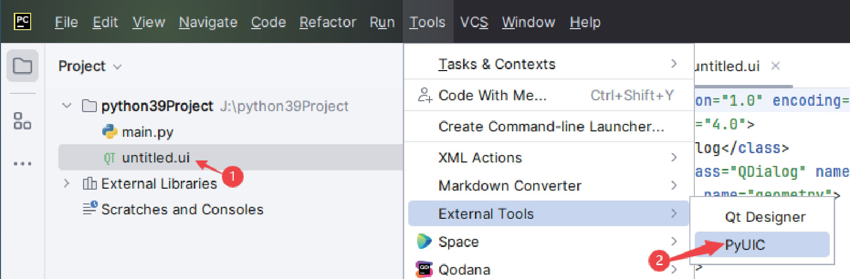 (2)在PyCharm的项目导航窗口中选中保存好的.ui文件,再选择菜单栏中的“Tools”→“External Tools”→“PyUIC”菜单,如图3.31所示。