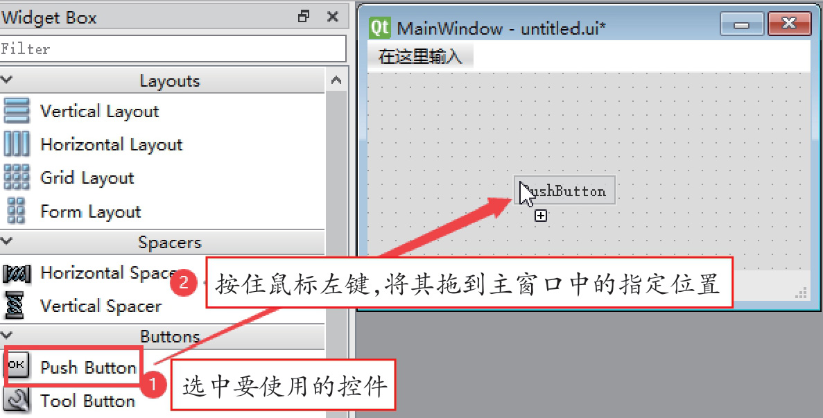 在设计主窗口时,只需要根据自己的需求,在左侧的“Widget Box”工具箱中选中相应的控件,接着按住鼠标左键,将其拖到主窗口中的指定位置即可,操作如图3.24所示。