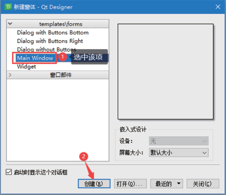 创建主窗口的方法非常简单,打开Qt Designer设计器后在“新建窗体”中选中“Main Window”选项,接着单击“创建”按钮即可,如图3.23所示。