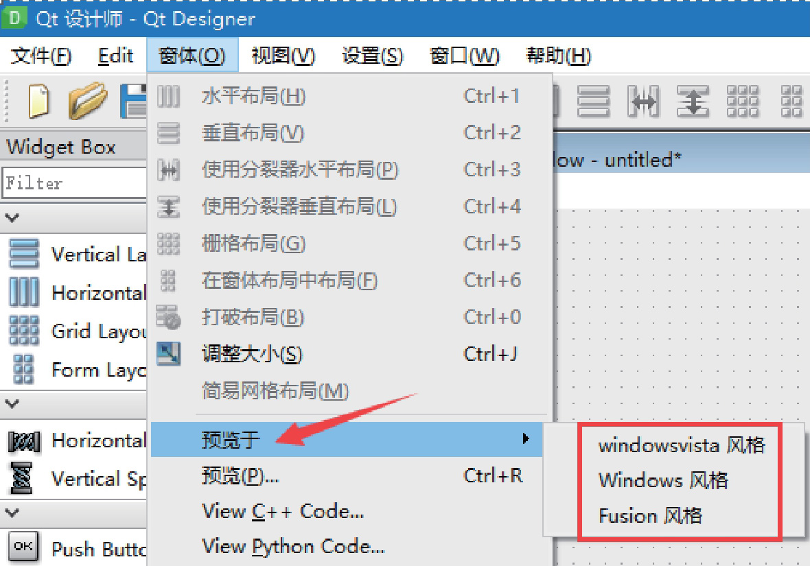 Qt Designer设计器提供的预览窗口效果的功能可让开发人员预览窗口在实际运行时的效果,以便根据该效果进行调整。该功能的具体使用方式为,在Qt Designer设计器的菜单栏中选择“窗体”→“预览于”,接着分别选择相应的菜单项,如图3.25所示,这里提供了3种风格的预览方式。