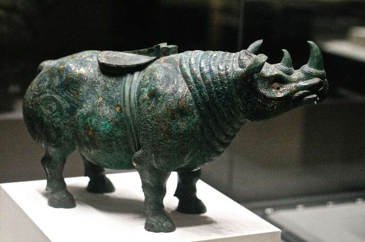 以我儿时逛动物园的经历,认为犀牛当属南方动物,可是在中原青铜器中,诸多犀牛的形象令我很是讶异,那个时候就有犀牛在水草丰美的原野上游弋?工匠们把小犀尊塑造得如此写实,如此活灵活现,一定对犀牛十分熟悉,做过仔细地观察与揣摩。文献告诉我们,那时的中原地区确实生活着犀牛,商代甲骨文中把犀牛称为“兕”(现代汉语词典中解释为“雌犀牛”),记载着一次田猎中射获兕 71 头,河南的殷墟与淅川下王岗等遗址中也出土过犀牛骨,可它们是什么时候在中原匿迹的呢?文献告诉我们,西汉晚期以后,中原人口迅速增加,犀牛迫于人类的压力,逐渐向南方退却,到了汉末魏晋之时,战乱频仍,人口大量南迁,犀牛更是只能困居边鄙之地了。《国语·楚语》中的一句:“巴蜀之犀象,其可尽乎”,长江中上游地区的犀象都近乎绝迹,何况中原。环境保护是人类永远的话题,无论远古还是现代。保护好环境,历史遗迹才能存留下去,否则,生存都受到威胁,那些文物的结局只能是“皮之不存,毛将焉附”。