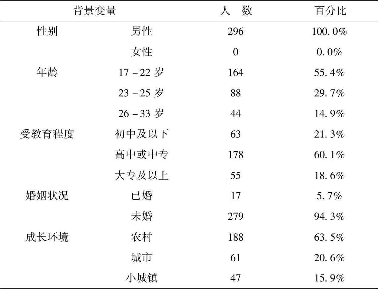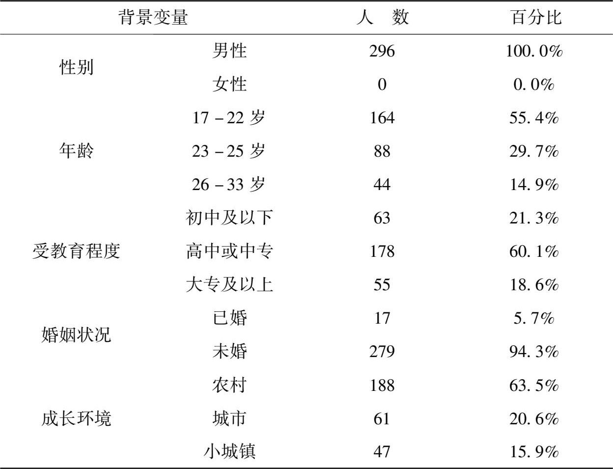 调查问卷回收后,剔除无效问卷后,获得有效问卷 296 份,被试的具体情况如表 1.9 所示。由表 1.9 可知,回收的有效问卷都为男性,占 100%。年龄层次情况:17 -22 岁 164 人,占55.4%,23 -25 岁 88 人,占 29.7%,26 -33 岁 44 人,占 14,9%。受教育程度情况,初中及以下 63 人,占 21.3%,高中或中专 178 人,占 60.1%,大专及以上 55 人,占 18.6%。婚姻状况:已婚 17 人,占 5.7%,未婚 279 人,占 94.3%。成长环境状况:来自农村的 188 人,占 63.5%,来自城市的 61 人,占 20.6%,来自小城镇的 47 人,占 15.9%。