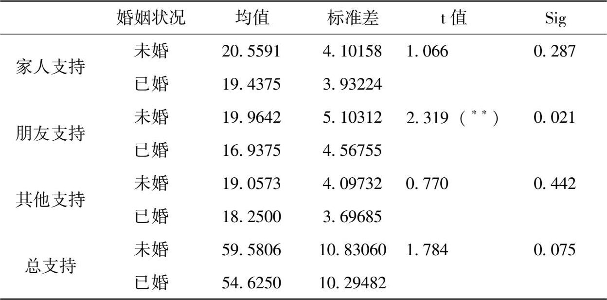 由表 1.14 可知,不同婚姻状况基层消防官兵的社会支持情况。由表 1.14 可知,除了在朋友支持维度上未婚的基层消防官兵获得的社会支持要非常显著高于已婚的基层消防官兵外,在家人支持、其他支持、总支持上,未婚与已婚消防官兵获得的社会支持没有显著差异。