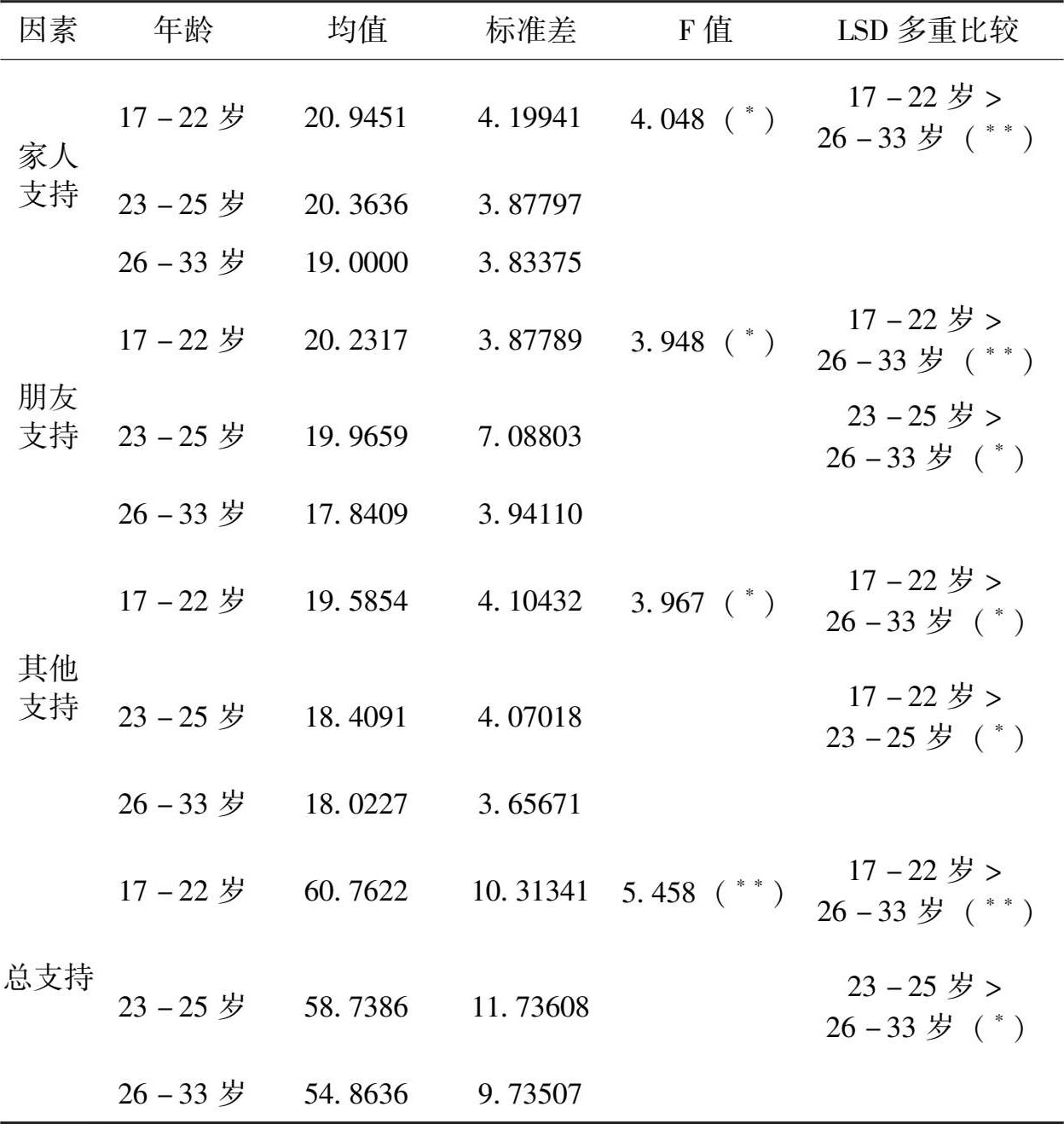 表1.11 不同年龄段基层消防官兵社会支持情况比较