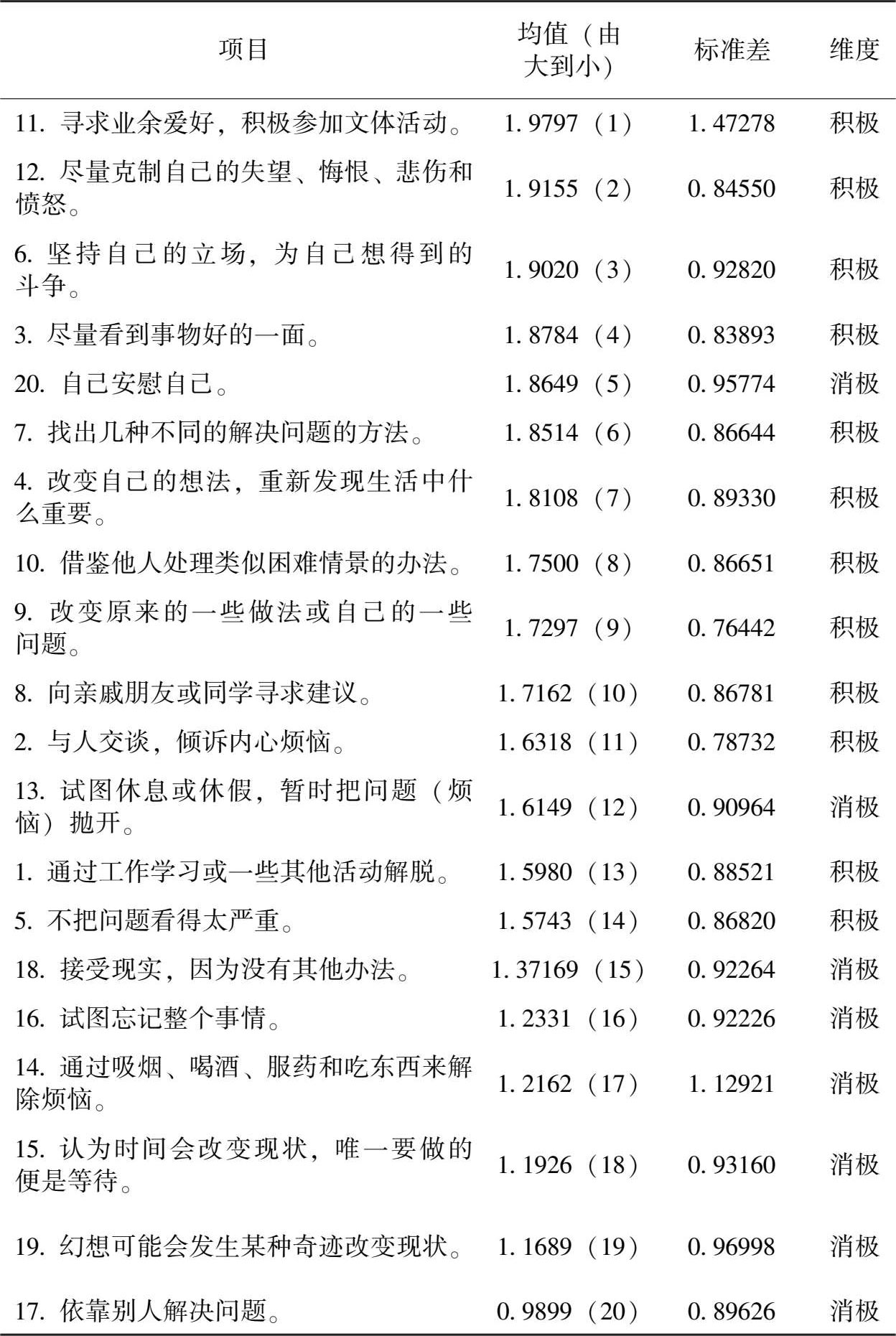 由表 1.2 可知基层消防官兵在简易应对方式量表各项目上的得分情况。通过表 1.2 可知,排在前 10 位的应对方式中有 9 项为积极应对,1 项为消极应对。排在后 10 位的应对方式中有 7 项为消极应对,3 项为积极应对。由此可看出,总体来说基层消防官兵采用频率较多的应对方式为积极应对。但有必要指出的是,所谓积极和消极是相对的,并不是积极的应对方式一定有积极的后果,或者消极的应对方式就肯定会产生消极的后果,如“接受现实”和“自己安慰自己”被归为消极应对,但其实是具有缓解挫折打击的作用。不同的应对方式,在不同时间和情景,在不同的人身上,会有不同的结果,这是需要进一步深入研究的问题。