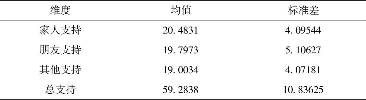 从表 1.10 可知基层消防官兵的社会支持情况,来自家人的支持得分最高,得分为 20.4831 ± 4.09544,其次是来自朋友的支持,得分为 19.7973 ± 5.10627,然后是其他支持,得分为19.0034 ± 4.07181,基层消防官兵社会支持的总得分为 59.2838± 10.83625。