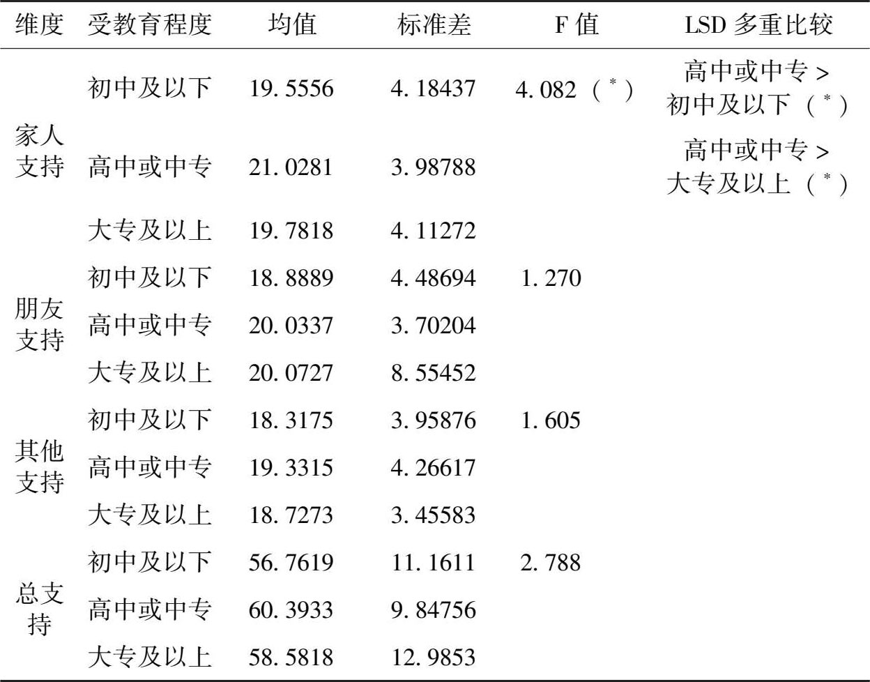 表1.12 不同受教育程度基层消防官兵社会支持情况比较