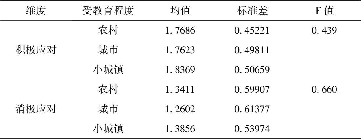 由表 1.6 可知,来自农村、城市、小城镇的基层消防官兵的应对方式没有显著的差异。