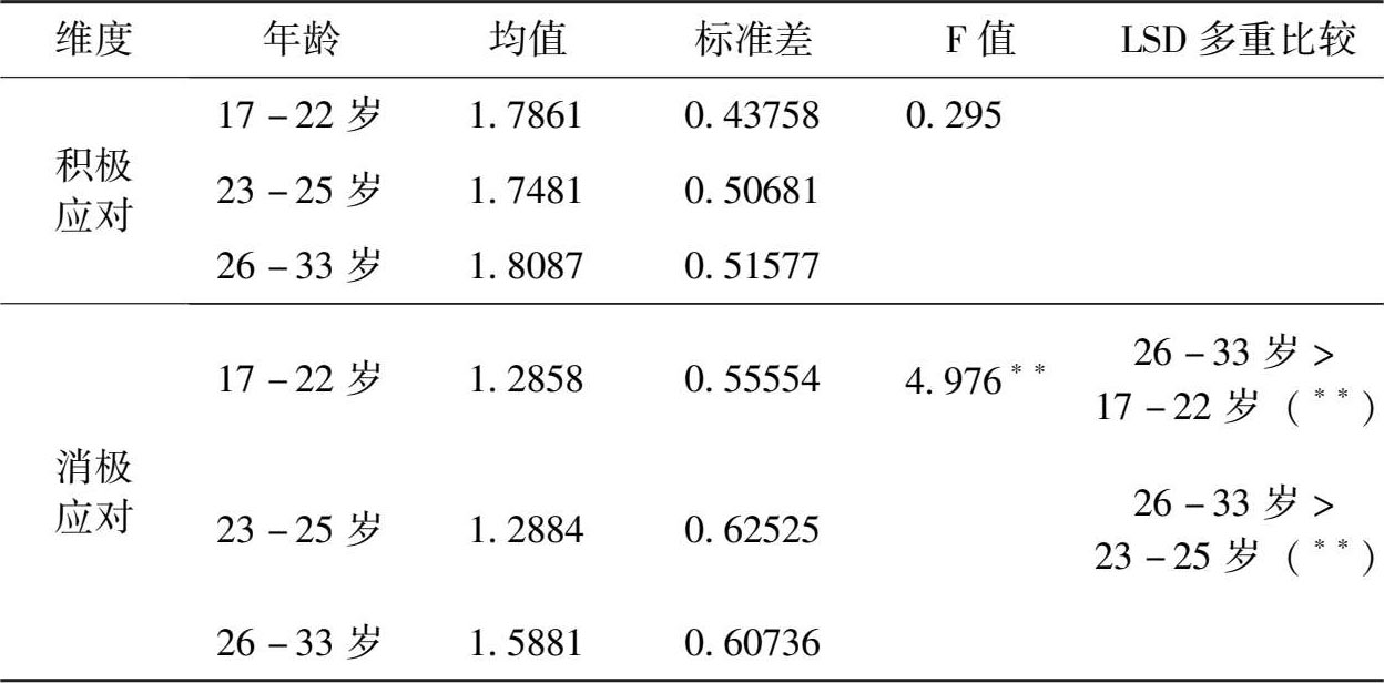 表1.4 不同年龄段基层消防官兵应对方式情况比较