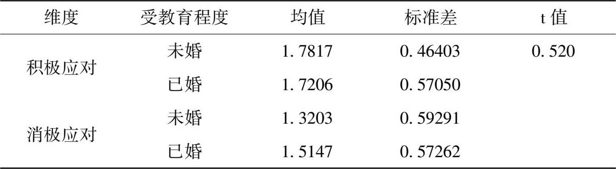 由表 1.7 可知,婚姻状况对基层消防官兵的应对方式也没有显著的影响。