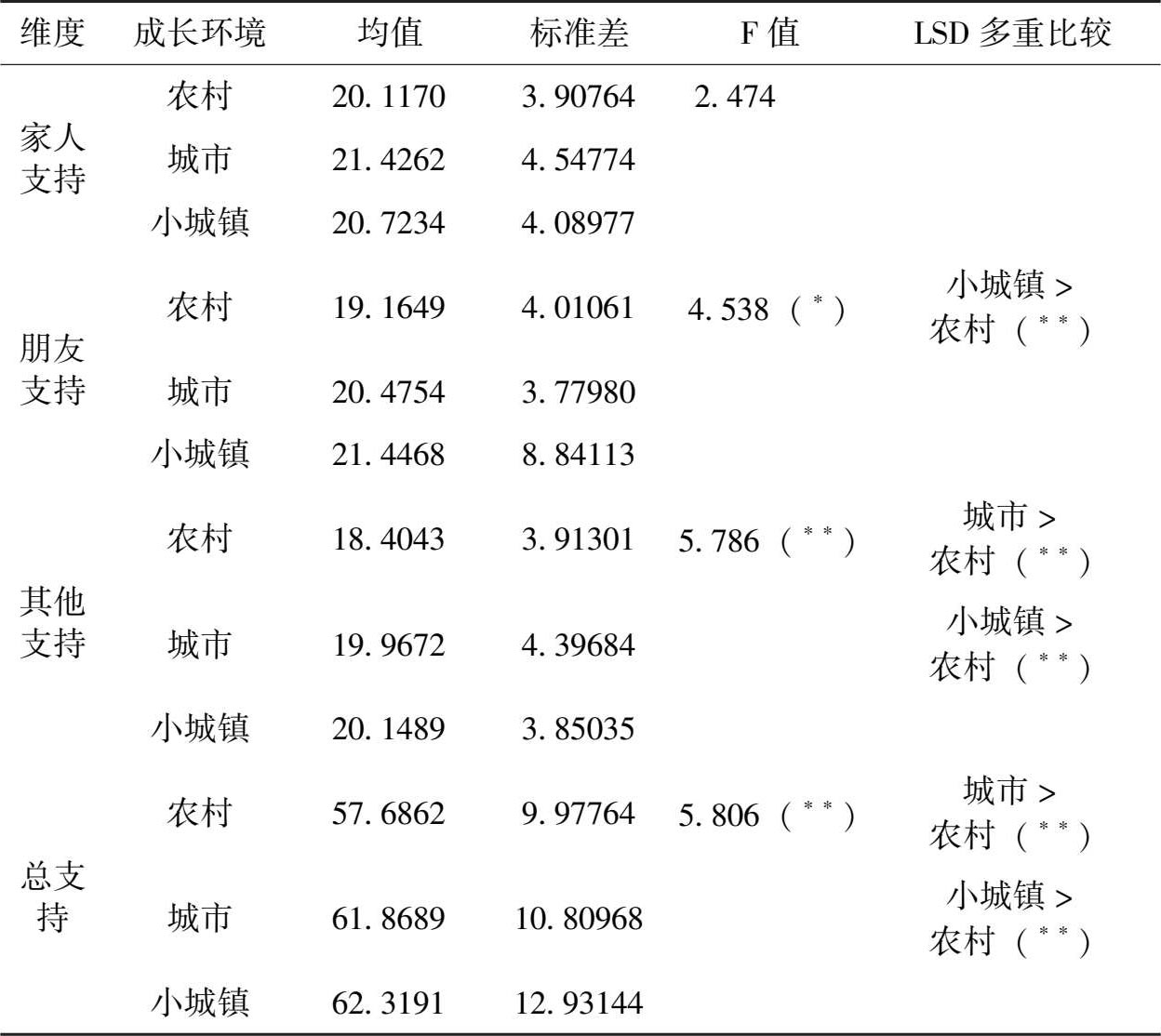 表1.13 不同成长环境基层消防官兵社会支持情况比较
