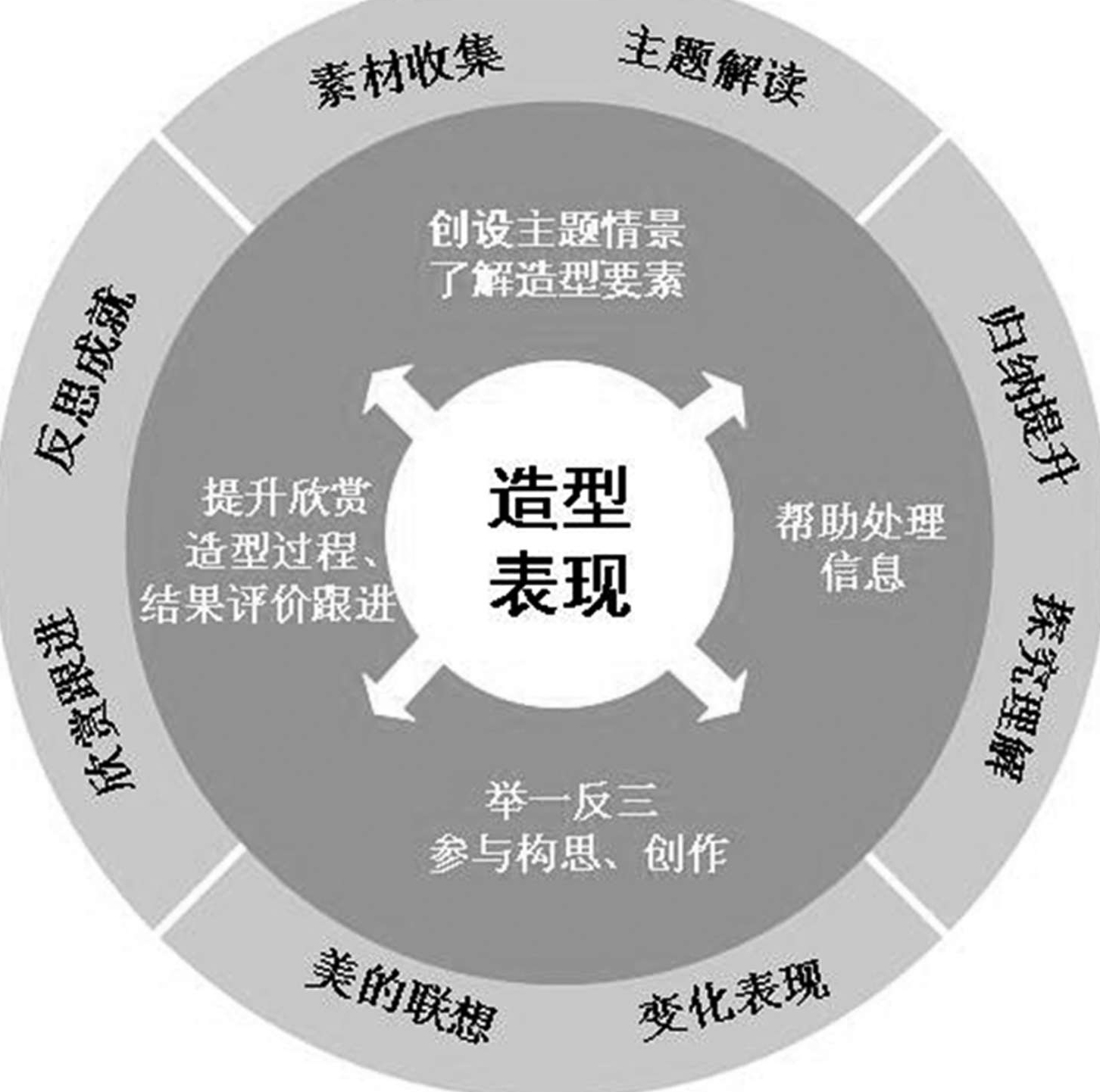 “造型·变现”学习领域板块图说明:此学习领域划分的四个板块,即“素材收集,主题解读”、“归纳提升,探究理解”、“美的联想,变化表现”、“欣赏跟进,反思成就”,它们之间没有先后之分,没有轻重之分。四大板块既独立又较之融合,最外层是为学生设计的学习活动,中间层是教师提供的相关辅助活动,里外两层活动相辅相成,回旋渗透,其目的就是让学生学会用艺术的手法去创造美好的形体,使他们的创作能够表现新的生活内容,感受创造表现的乐趣。