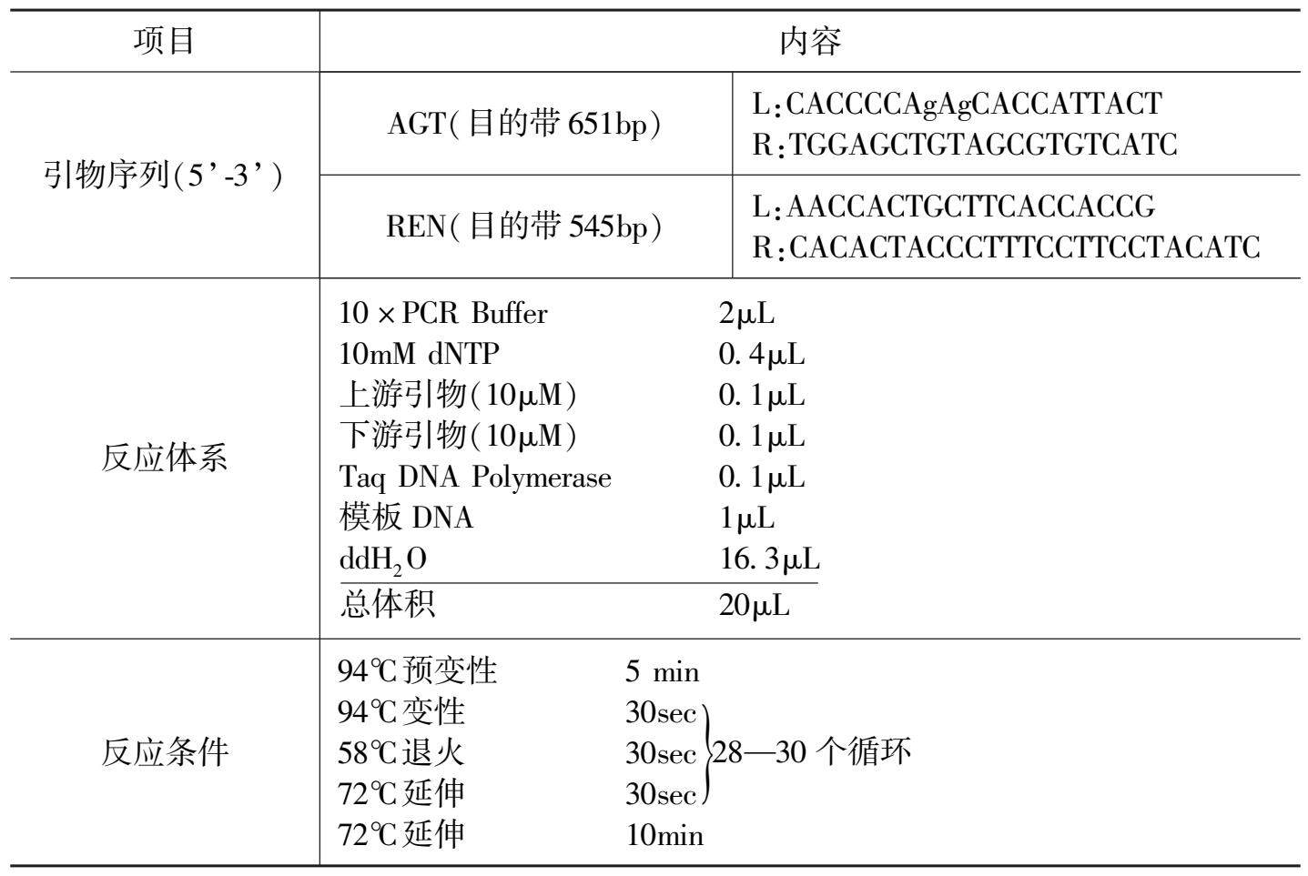 本研究针对人AGT和REN基因利用引物设计软件Primer5.0 设计特异性的引物,由上海生物工程有限公司合成。两种转基因小鼠PCR鉴定所用反应体系和反应条件相同,具体内容见表 2。
