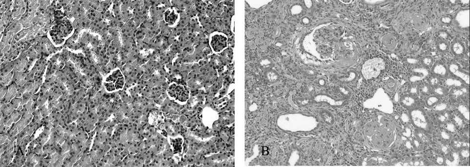 图 7 正常野生小鼠(A图)和AGT⁃REN双转基因小鼠(B图)肾组织