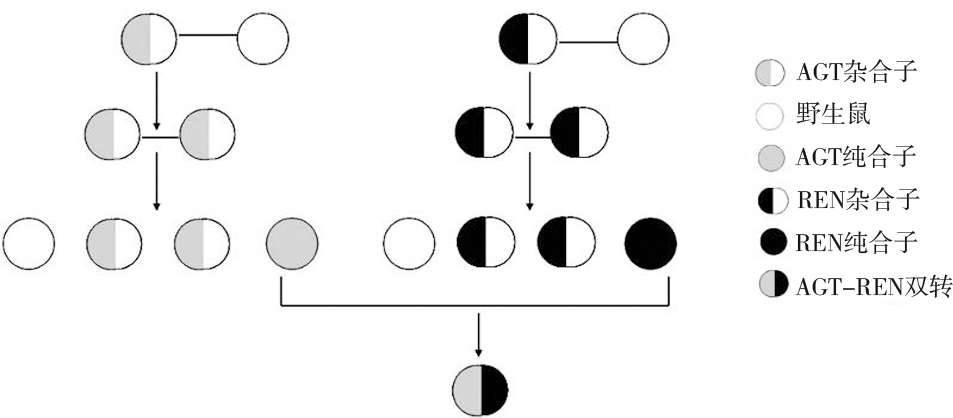 将引进的人AGT和REN杂合子转基因小鼠作为F1 与野生型C57 小鼠交配(见图 1),仔鼠生后 10—14 天剪趾编号、剪鼠尾,-20℃冰箱保存备用。