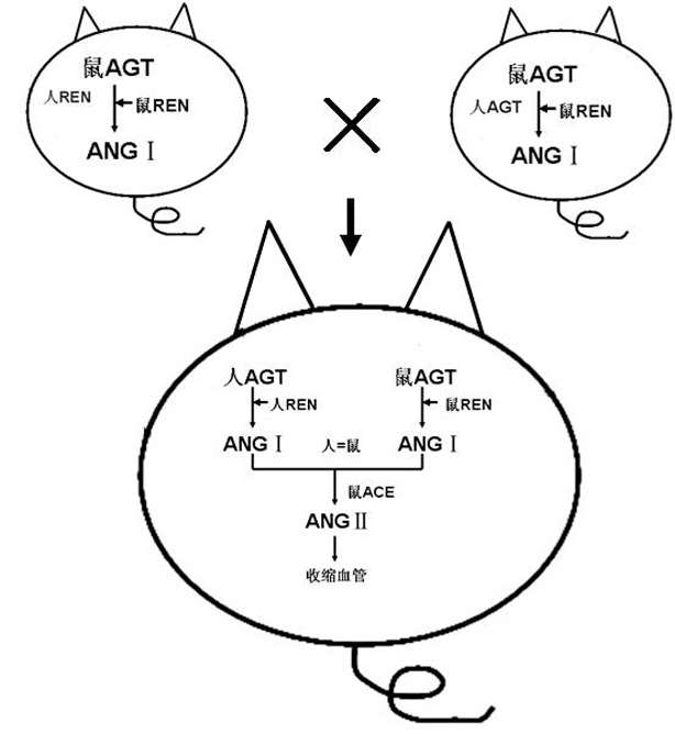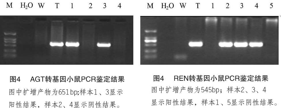本研究利用PCR的方法鉴定了AGT、REN转基因小鼠并筛选出两种转基因小鼠的纯合子,然后对两种转基因小鼠进行了交配,得出如下结论: