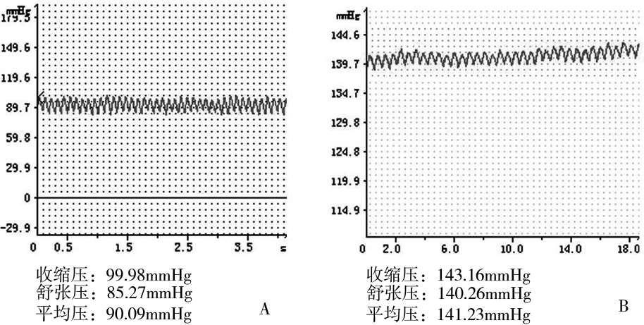图 6 正常野生小鼠(A图)和AGT⁃REN双转基因小鼠(B图)血压